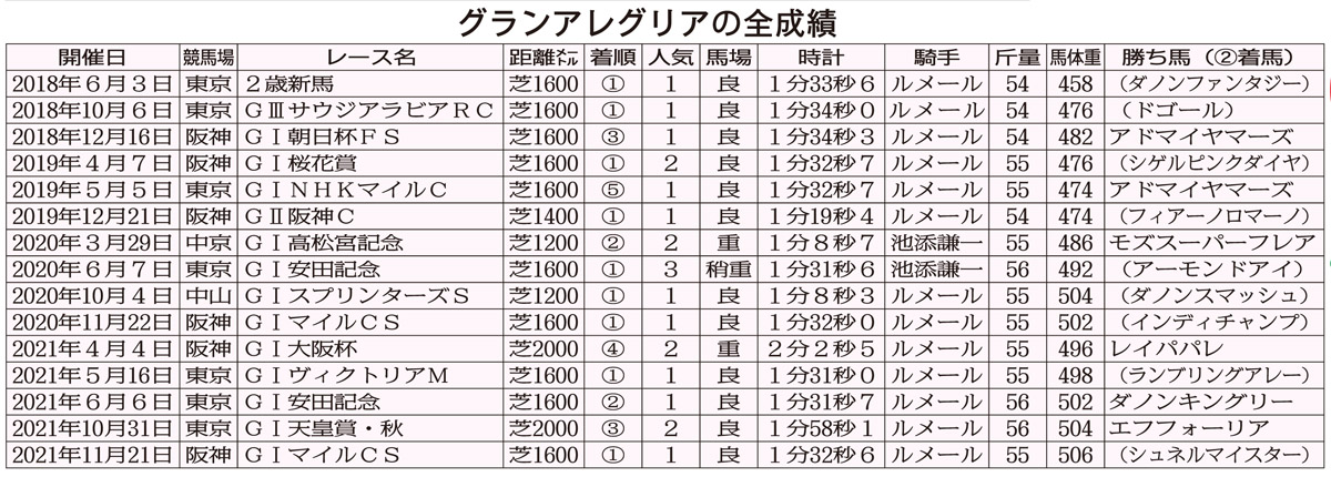 母としても成功した牝馬といえば、最近ではエアグルーヴやシーザリオが思い浮かぶ。この2頭のファミリーからは名馬が次から次へと生まれている。グランアレグリアも、偉大な2頭に続くのか。この馬の第2章は、まだ始まったばかりだ。