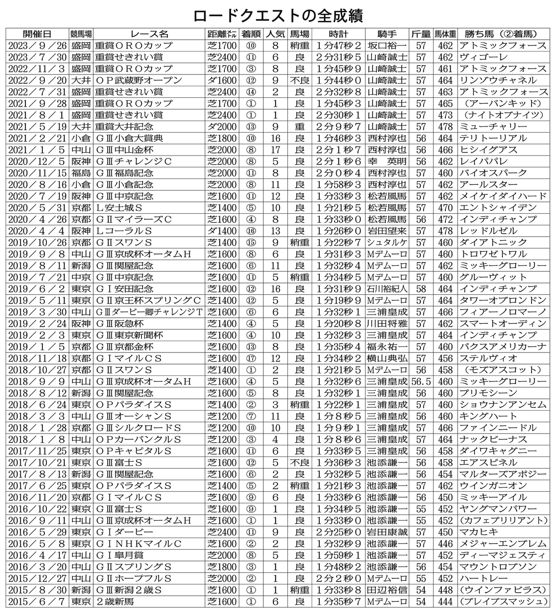 新潟2歳Sは2002年に距離がマイルに延長されると、クラシックに直結するようになる。13年の勝ち馬ハープスターは桜花賞馬で、札幌記念Vから凱旋門賞にも駒を進めた。15年にこのレースを制したのがロードクエストだ。翌年はNHKマイルCで②着と惜しくもGⅠタイトルを逃したが、秋にはGⅢ京成杯オータムHをゲットし、18年にはGⅡスワンSで3つ目の重賞タイトルを獲得した。今どうしているのか。